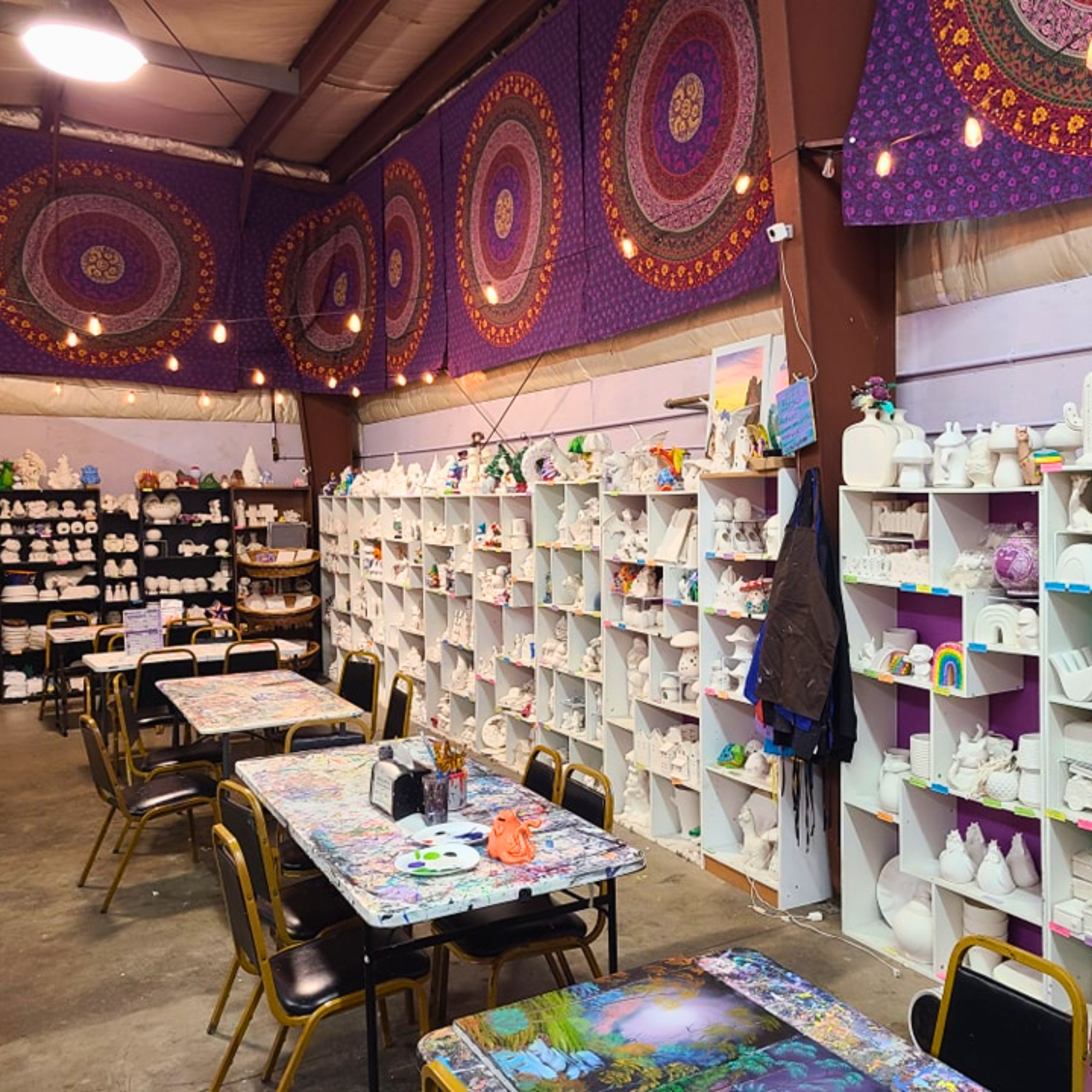 An all ages walk-in art studio offering ceramic, wood, canvas painting, and more!