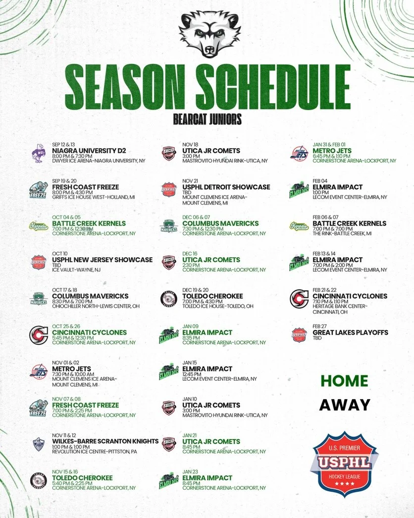 Stop on by Cornerstone Ice Arena this season and show your support for the Bearcat Juniors 🏒 Home games are highlighted in green above!