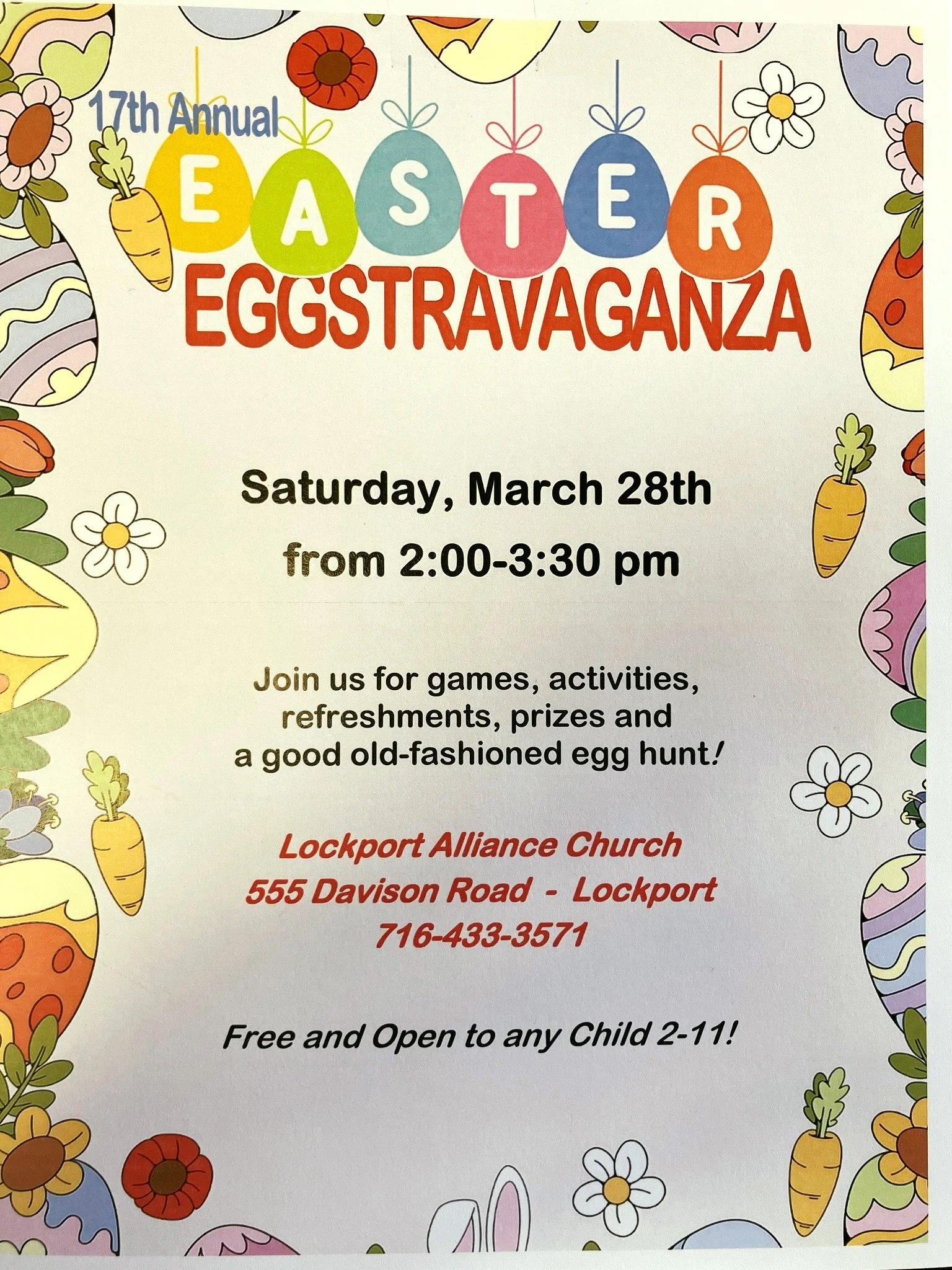 Join us for the 17th Annual Easter Eggstravaganza on March 28 from 2PM-3:30 PM at Lockport Alliance Church for games, prizes, treats, & an egg hunt! FREE for kids ages 2–11.