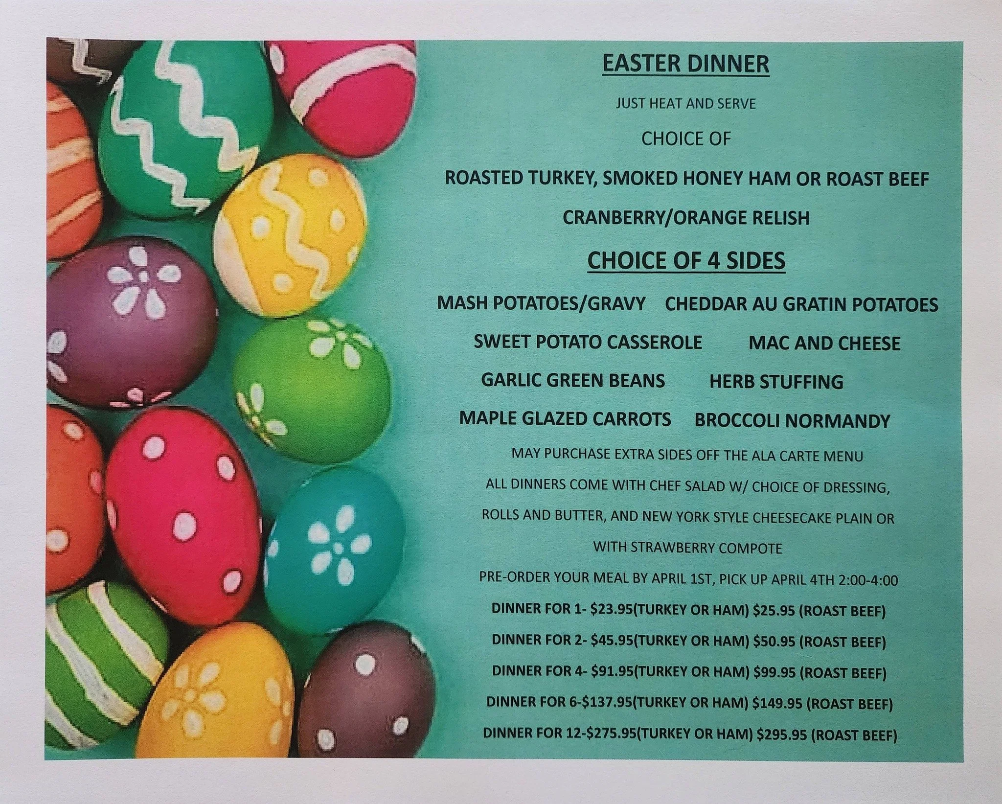 Tom's Diner is serving Easter dinners to go! Enjoy family time more, because the cooking is done by them! They are serving our traditional, essential and Ala Carte sides for 1,2,4,6 and 12 people!! Please order by April 1st. Call 716-439-4283 or use our Google forms to place your order. Find all the details at: https://www.facebook.com/share/p/18CgPBND3v/