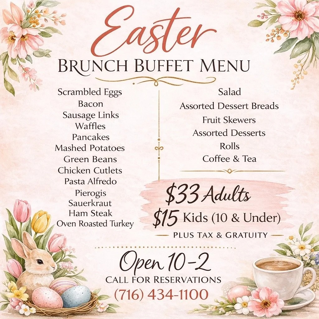 Easter Brunch is just around the corner and Stooges is excited to host you! Enjoy their Easter Brunch Buffet from 10AM-2PM, featuring a variety of sweet and savory favorites for the whole family to enjoy. Reservations are strongly recommended, as seating fills quickly each year. Call (716) 434-1100 to reserve your table.