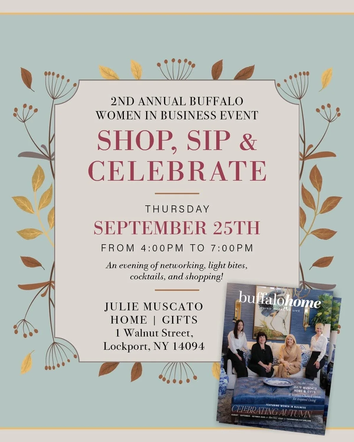 Join Julie Muscato Home | Gifts at 1 Walnut Street for an evening of networking, cocktails/mocktails, appetizers, and shopping as we celebrate incredible women in business and local influencers from Western New York.