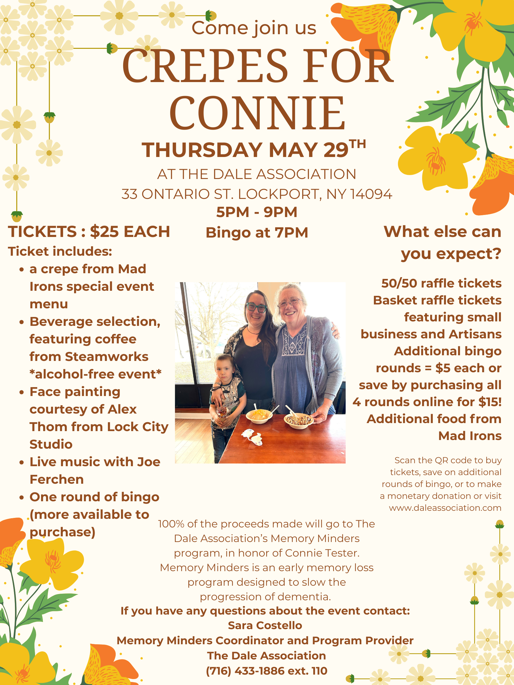 Save the Date! The Dale Association will host Crepes for Connie on Thursday, May 29th from 5 PM to 9 PM at 33 Ontario Street in Lockport. Tickets include a crepe from Mad Irons’ special event menu, a beverage selection featuring coffee from Steamworks (this is an alcohol-free event), face painting by Alex Thom of Lock City Studio, live music performed by Joe Ferchen, and a round of bingo at 7 PM. Additional bingo rounds and food options will also be available for purchase.