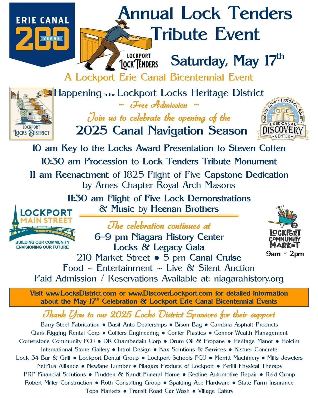 The Niagara History Center will present its annual Key to the Locks Award to Steven Cotten at 10AM on Saturday, May 17th followed by the Lock Tenders Tribute Procession. Members of the Ames Royal Arch Chapter of the Free and Accepted Masons will hold a reenactment of the laying of the capstone at the base of the Erie Canal Flight of Five Locks at 11AM. Lockport’s volunteer Lock Tenders will demonstrate locking the Erie Traveler through the Flight of Five Locks starting at 11:30AM, with live music from The Heenan Brothers. The Locks District Museum will be open for visitors throughout this time. Stop on by for a fun morning!