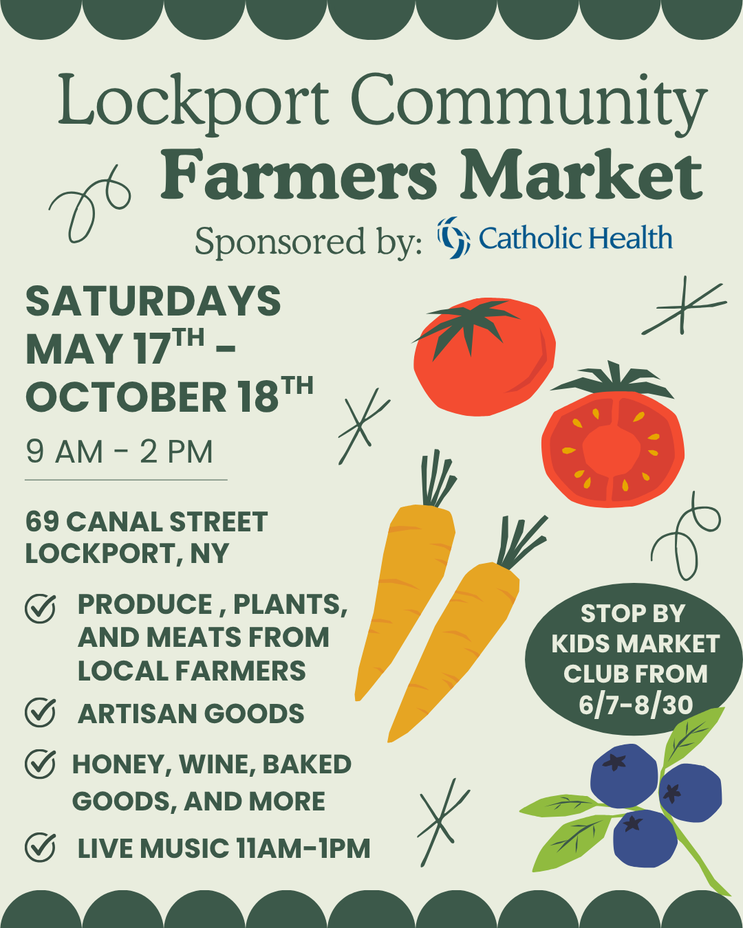 Stop on the Lockport Community Farmers Market every Saturday from May 17th to October 18th from 9am to 2pm at 69 Canal Street! Shop fresh produce, meat, and plants from local farmers, baked goods, honey, wine, artisan goods, doggie treats, and so much more with live music at the gazebo from 11am to 1pm. Don’t miss this incredible market alongside the Erie Canal in Lockport, New York!